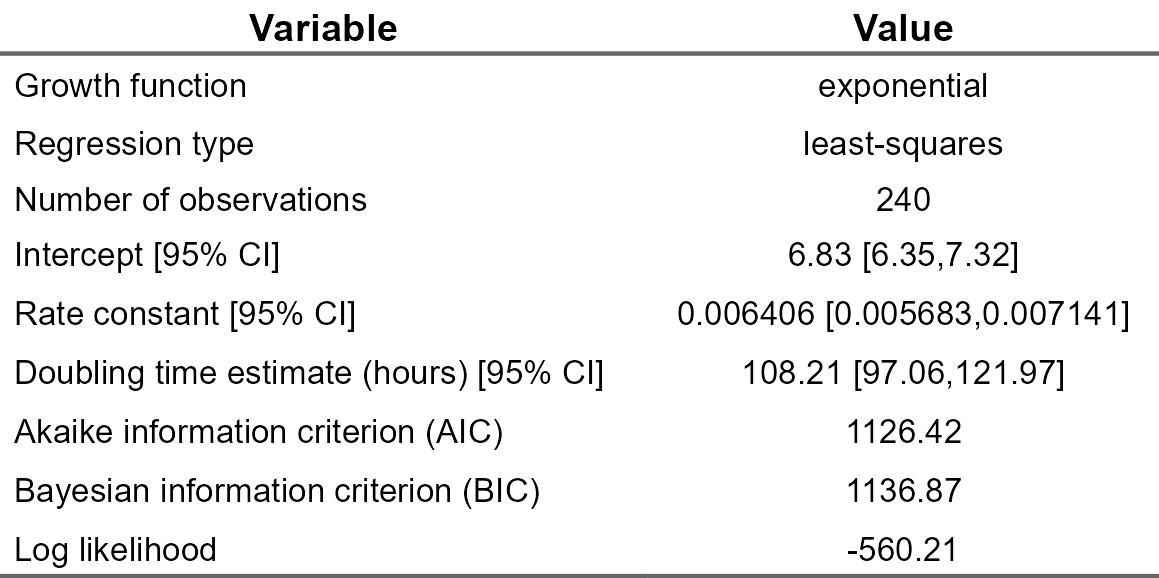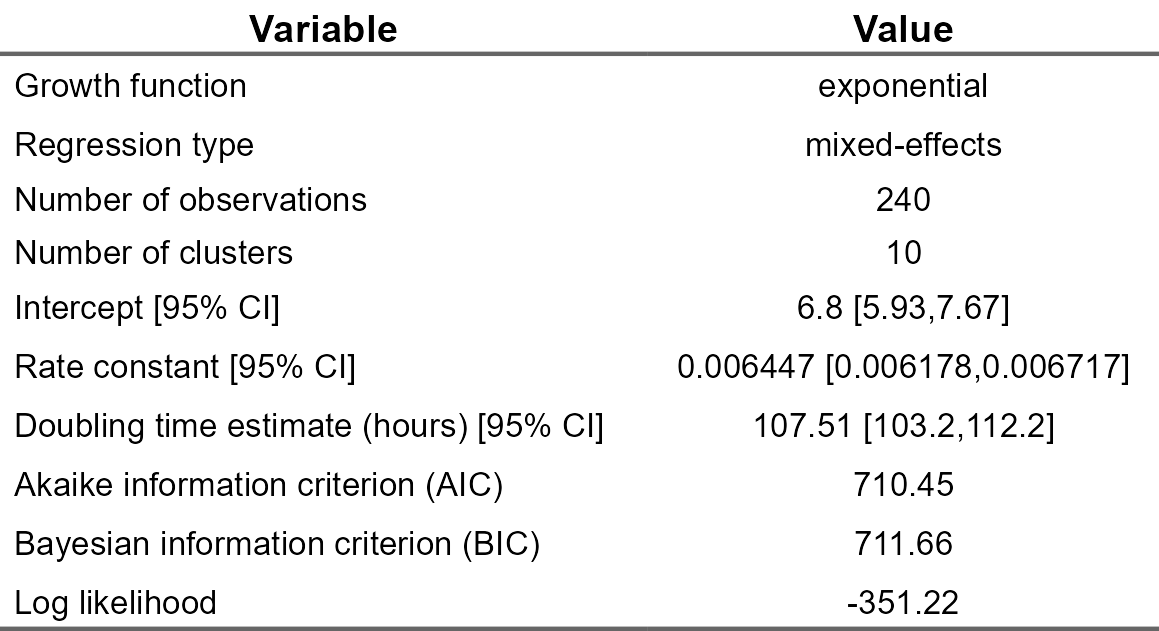 Users can produce a summary table of the model results and derived growth metrics for reporting. We can see in this example that the confidence interval for the rate and doubling time estimates are narrower than the least-squares regression model after accounting for the inherit well-to-well variation. Model complexity metrics such as Akaike information criterion (AIC), Bayesian information criterion (BIC), and Log likelihood show that the mixed-effects model is better suited for the data which contains clear hierarchical structures and longitudinal measurements.