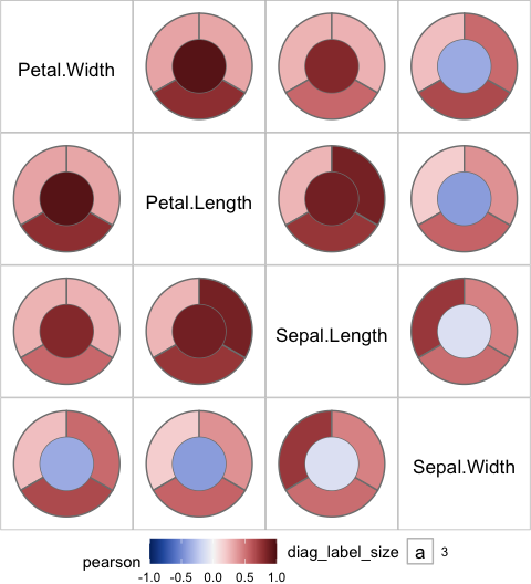 to see the groups represented by the wedges. The ungrouped Pearson correlation of Sepal.Width with the other three variables is negative, but the correlations for each of the Species is positive.
