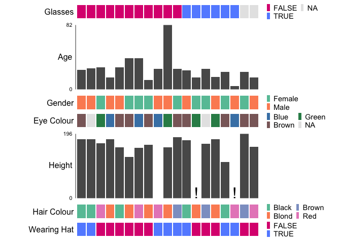 Effortlessly visualize all columns in a data frame with vertically aligned plots and automatic plot selection based on variable type. Plots are fully interactive, and custom tooltips can be added.
