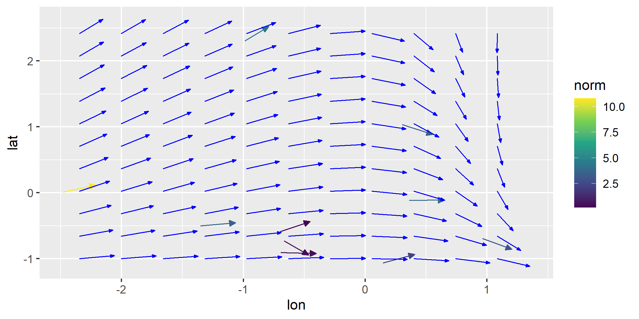 geom_vector(aes(x = lon, y = lat, fx = fx, fy = fy), center = FALSE, normalize = FALSE)