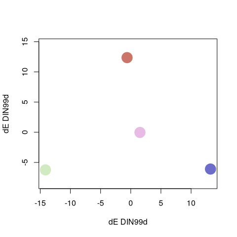 The palette may also be plotted with in a multidimensional scaling plot generated from the distance matrix of the colors in the palette.