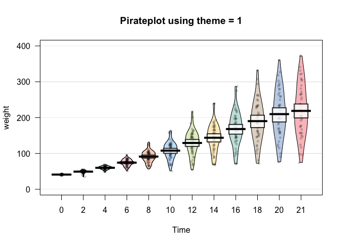 The pirateplot function creates a pirateplot, a transparent (both literally and figuratively) plot for displaying continuous data as a function of 1, 2, or 3 discrete variables. Unlike traditional plots, like barplots and boxplots, the pirateplot shows both raw data (jittered points), descriptive statistics (line and/or bar), and inferential statistics (95% Bayesian Highest Density Intervals or Confidence Intervals), in one plot. While the default plot shows all these elements, the user can easily customize the transparency of each element using additional arguments.