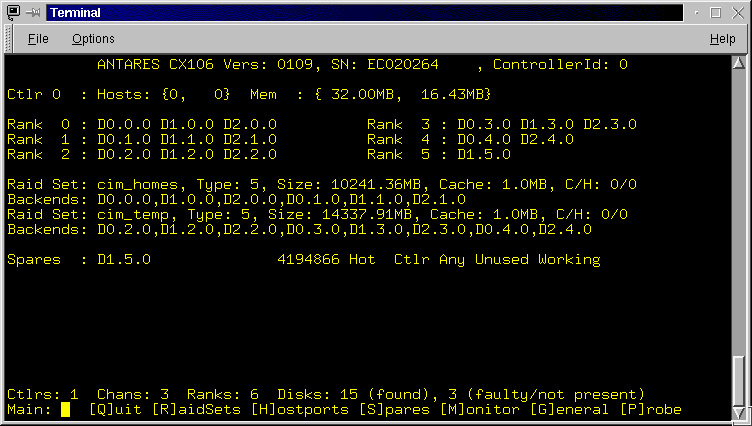 Next the spare devices are configured. Each spare is named (device_type_c.s.l format), followed by it's size (in 512-byte blocks), it's spin state (Hot or Warm), it's controller allocation , and finally it's current status (Used/Unused, Faulty/Working). If used, the raid set that uses it is nominated.