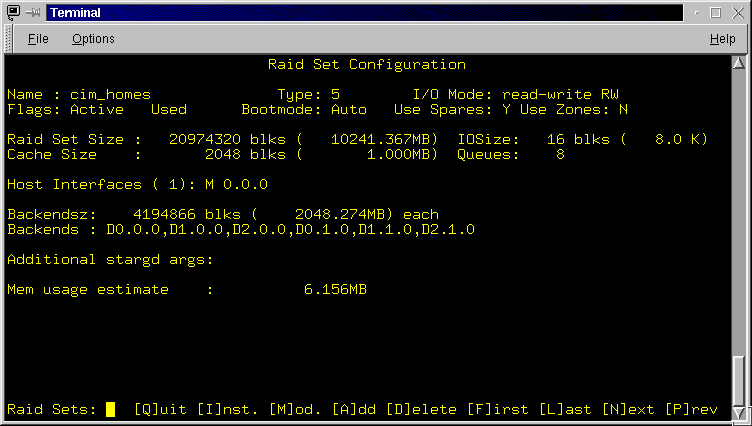 The next set of lines provide a summary of the Raid Sets configured on the RaidRunner. The summary includes the raid set name, it's type, it's size, the amount of cache allocated to it and a comma separated list of it's backends. See rconf in the "Advanced Topics" section for a full description of the above.