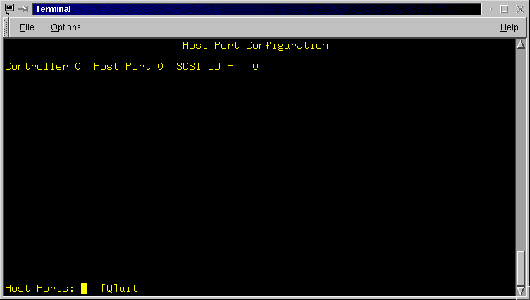 The Host Port Configuration screen (Figure 3.3) displays for each controller, each host port (labelled A, B, C, etc for port number 0, 1, 2, etc) and the assigned SCSI ID. If the RaidRunner you use, has external switches for host port SCSI ID selection, you may only exit ([Q]uit) from this screen. If the RaidRunner you use, does NOT have external switches for host port SCSI ID selection, then you may modify (and hence install) the SCSI ID for any host port. The menu line allows one to leave the Host Port Configuration screen or select further actions (if NO external host).