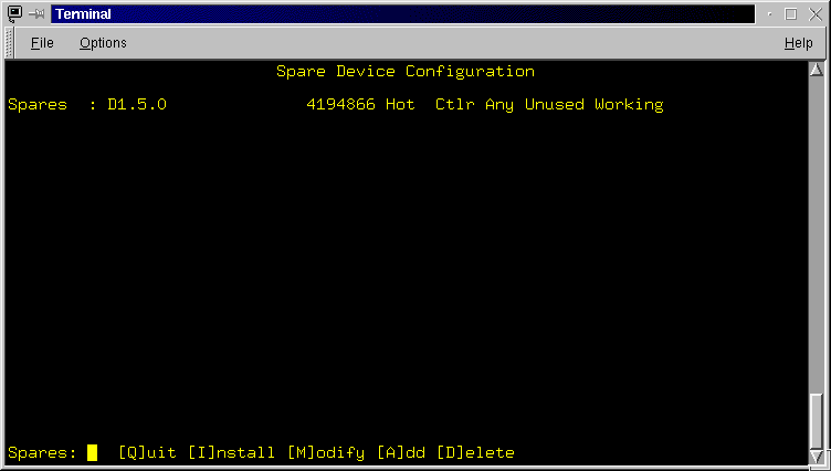 The Spare Device Configuration screen (Figure 3.4) displays all configured spare devices in the data area and provides a menu which allows you to Add, Delete, Mod­ ify and Install (changes) spare devices. If no spare devices have been configured, only the screen title and menu is displayed. Each spare device displayed, shows it's name (in device_type_c.s.l format), it's size in 512-byte blocks, it's spin status (Hot or Warm), it's controller allocation, finally it's current status (Used/Unused, Faulty/Working). If used, the raid set that uses it is nominated. For information on each attribute of a spare device, see the rconf command in the "Advanced Topics" section. The menu line allows one to leave the Spare Device Configuration screen or select further actions.