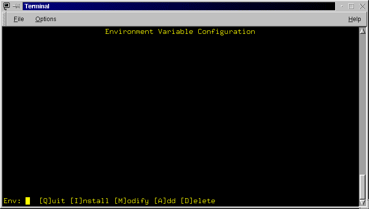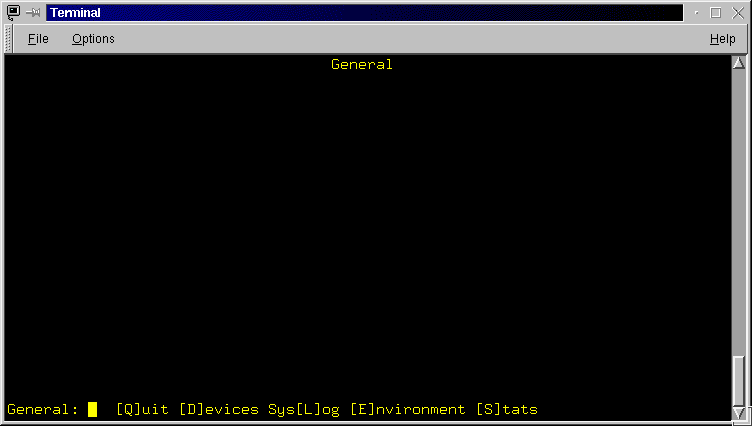 The General screen (Figure 3.6) has a blank data area and a menu which allows one to Quit and return to the main screen, or to select further sub-menus which provide information about Devices, the System Message Logger, Global Environment variables and throughput Statistics.