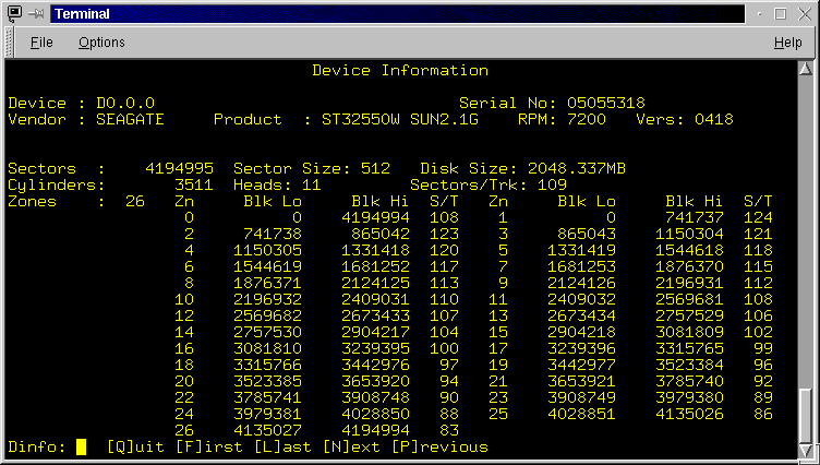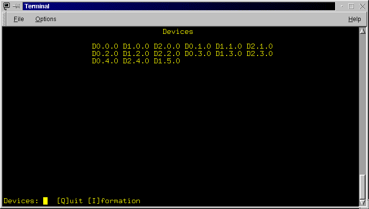 This will tell you the type, target number, and logical unit number of every SCSI device recognized in your system. The 5070 RAIDium board will report itself attached to an ISP controller at target 0 with two Logical Unit Numbers (LUNs): 0 for the virtual hard disk drive, and 7 for the connection to the Graphical User Interface (GUI). Note: the GUI communication channel on LUN 7 is currently unused under Linux. See the discussion under "SCSI Monitor Daemon (SMON)" in the "Advanced Topics" section for more information.