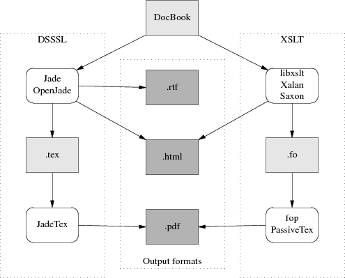 The DSSSL toolchain is what processed DocBook SGML. Under it, a document goes from DocBook format through one of two closely-related stylesheet engines called Jade and OpenJade. These turn it into a TeX-macro markup, which is processed by a package called JadeTeX, into DVIs, which then get turned into Postscript.