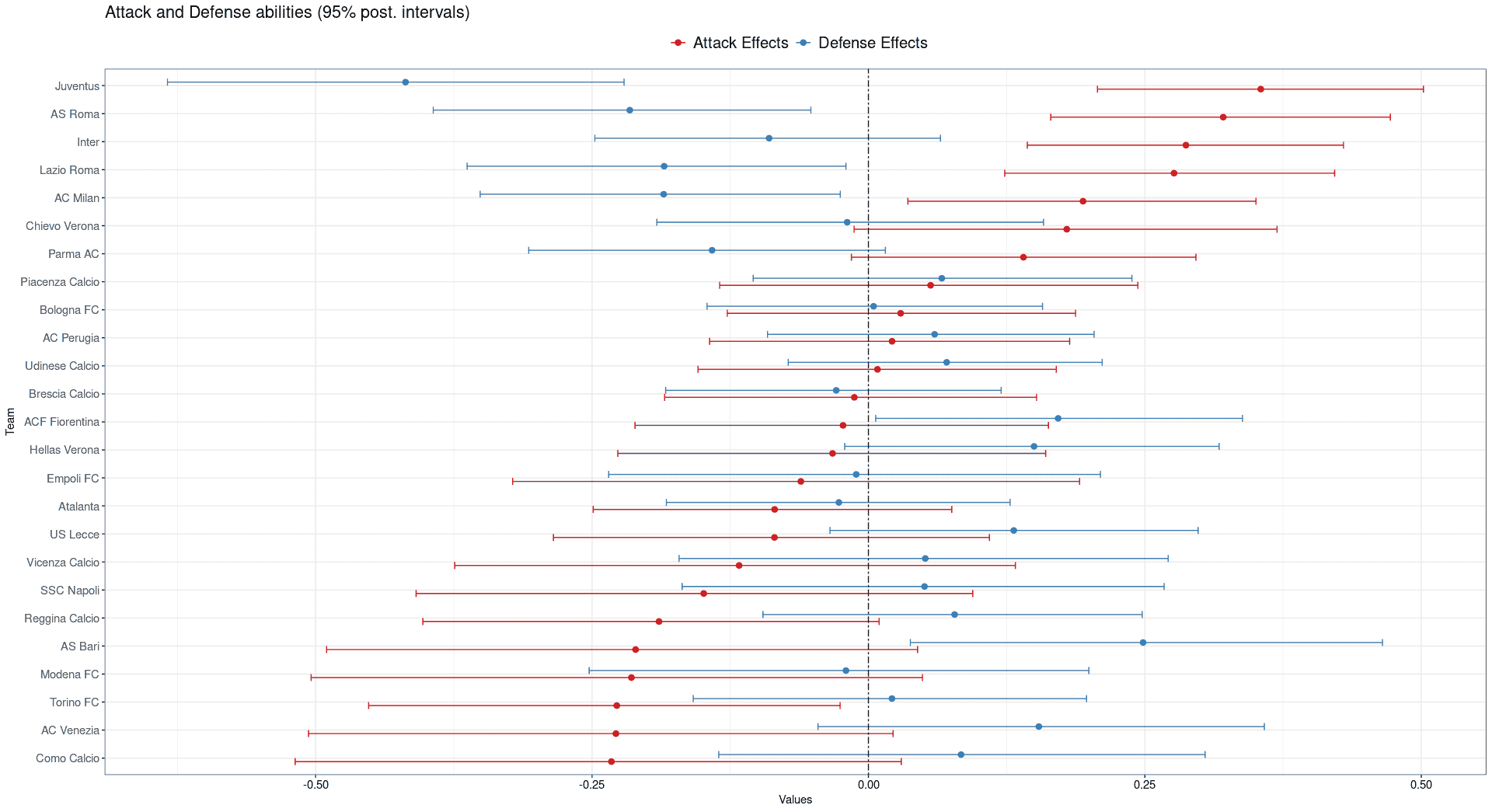 In what follows, a quick example to fit a Bayesian double Poisson model for the Italian Serie A (seasons 2000-2001, 2001-2002, 2002-2003), visualize the estimated teams’ abilities, and predict the last four match days for the season 2002-2003: