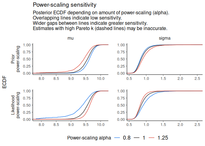 Power-scaling sensitivity analysis and priorsense are described in Kallioinen et al. (2023).