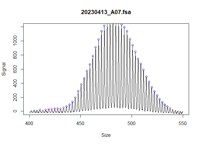 fsa_list <- lapply(cell_line_fsa_list, function(x) x$clone())The known ladder sizes are assigned to peaks in the ladder channel and bp are predicted for each scan.