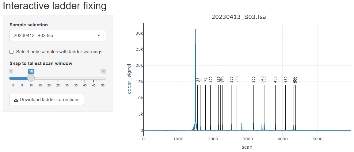 If starting from fsa files, the GeneScan™ 1200 LIZ™ dye Size Standard ladder assignment may not work very well. The ladder identification algorithm is optimized for GeneScan™ 500 LIZ™ or GeneScan™ 600 LIZ™ or other ladders with relatively few peaks. The 1200 LIZ™ ladder has a challenging pattern of ladder peaks to automatically assign. However, these ladders can be fixed by playing with the various parameters or manually with the built-in fix_ladders_interactive() app.