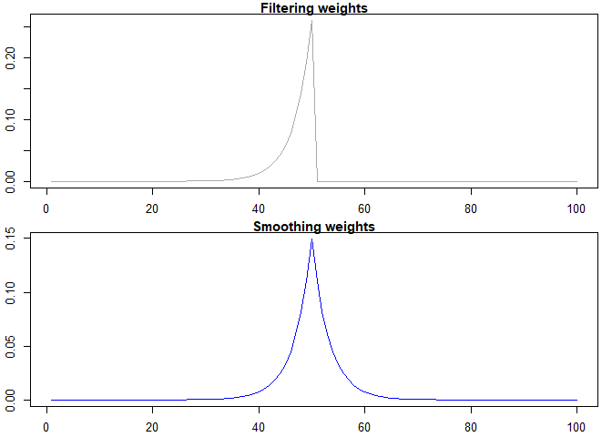 It is also easy to verify the identity between the smoothed and filtered levels obtained from the Kalman filter and the corresponding estimates computed using the weights.