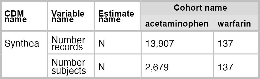 #> $ cdm_name         <chr> "Synthea", "Synthea", "Synthea", "Synthea"