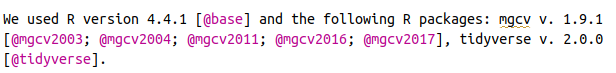 "Wir verwendeten die R version 4.5.1 [@base] und die folgenden R-Pakete: badger v. 0.2.5 [@badger], desc v. 1.4.3 [@desc], knitr v. 1.50 [@knitr2014; @knitr2015; @knitr2025], mgcv v. 1.9.3 [@mgcv2003; @mgcv2004; @mgcv2011; @mgcv2016; @mgcv2017], pkgdown v. 2.1.3 [@pkgdown], remotes v. 2.5.0 [@remotes], renv v. 1.1.5 [@renv], rmarkdown v. 2.29 [@rmarkdown2018; @rmarkdown2020; @rmarkdown2024], testthat v. 3.2.3 [@testthat], tidyverse v. 2.0.0 [@tidyverse], visreg v. 2.7.0 [@visreg]."
